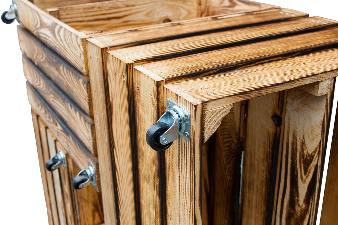 Sie erhalten einen komplett zusammengebauten Couchtisch aus schönen geflammten Regalkisten. Zwei Kisten haben einen Zwischenboden in "quer", zwei in "längs". Der Tisch ist sehr stabil und bietet viel Stauraum. Durch die Rollen kann der Tisch problemlos bewegt werden.