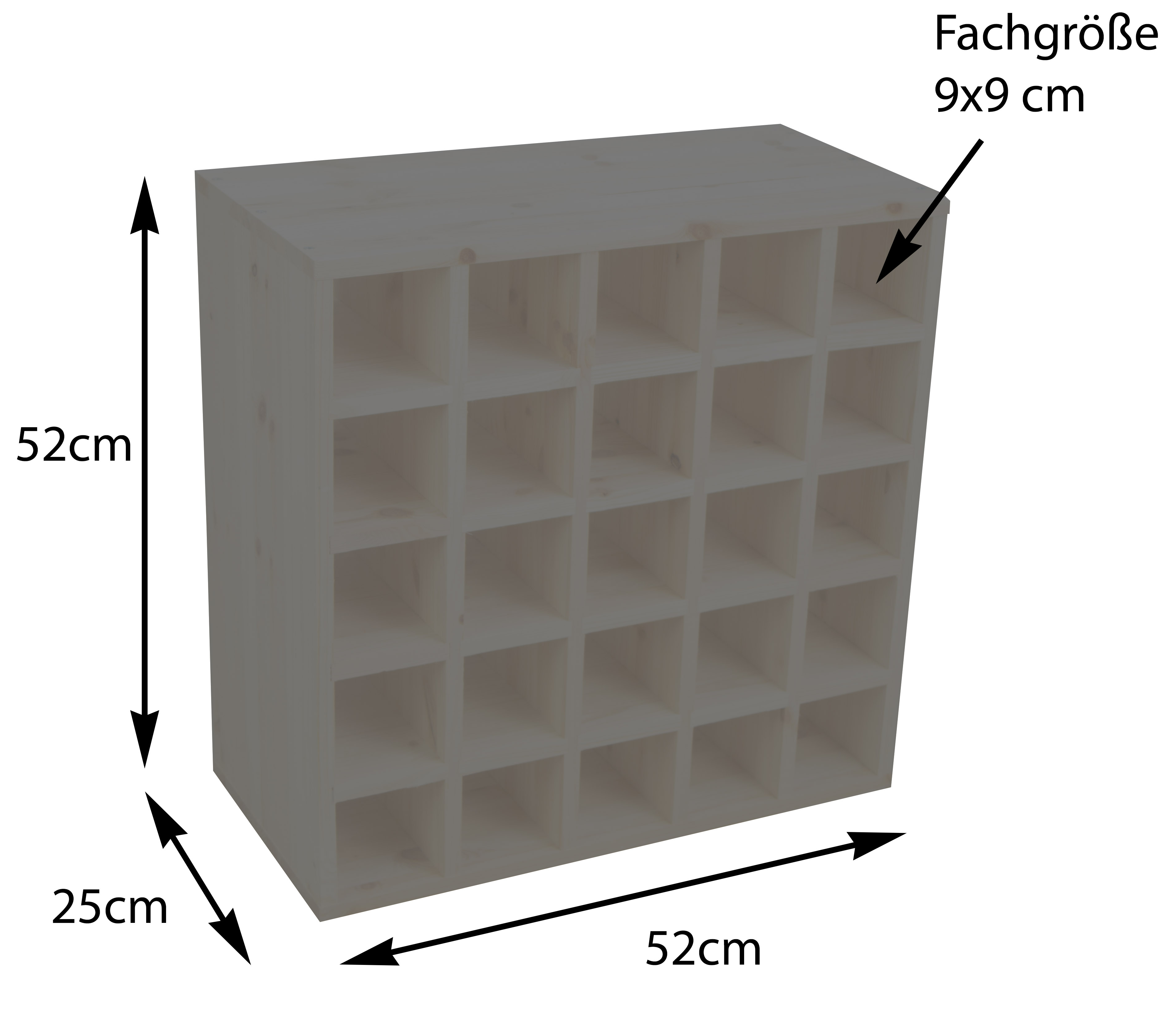 Unsere 3er Serie grosses Weinregal bestehend aus unserem "25er" "X" & Raute, haben alle die Abmessungen 52 x 52 x 25cm L x H x T. Diese Weinregale lassen dich wunderbar miteinander kombinieren, bieten dann auch Platz für alle Flaschengrößen. Das X und das Rautenregal müssen vorab montiert werden, was aber sehr leicht mit einer kleinen Montageanleitung umzusetzen ist. Das 25er Weinregal kommt hingegen fertig montiert zu Ihnen nach Hause. Wie die Zusatzbezeichnung bereits verrät, hat dieses Regal Platz für 25 Flaschen.
