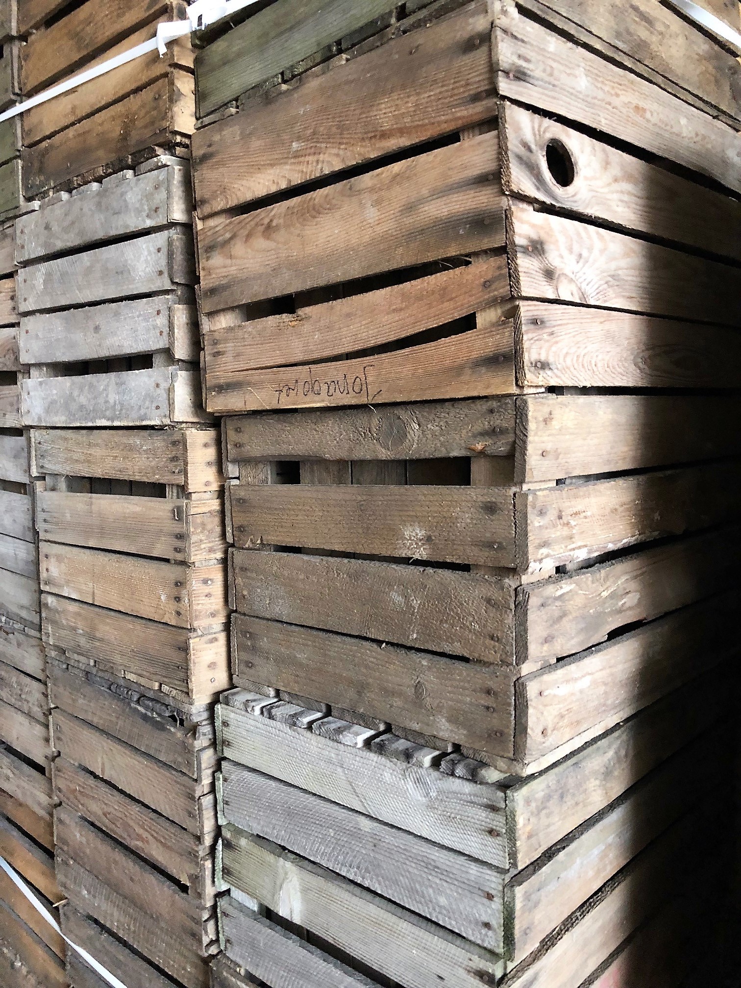 Diese Kiste hat helles Holz und keinen Aufdruck. Sie besteht aus vier Seitenbrettern und fünf Längsbodenbrettern. Sie war bei nur wenigen Apfelernten im Einsatz und ist daher noch von guter Qualität und sehr stabil. Sie ist vielseitig verwendbar, zum Beispiel für den Transport von Gegenständen, Bau eines Regales oder Tisches. Genauso schön kann man sie für dekorative Zwecke verwenden.